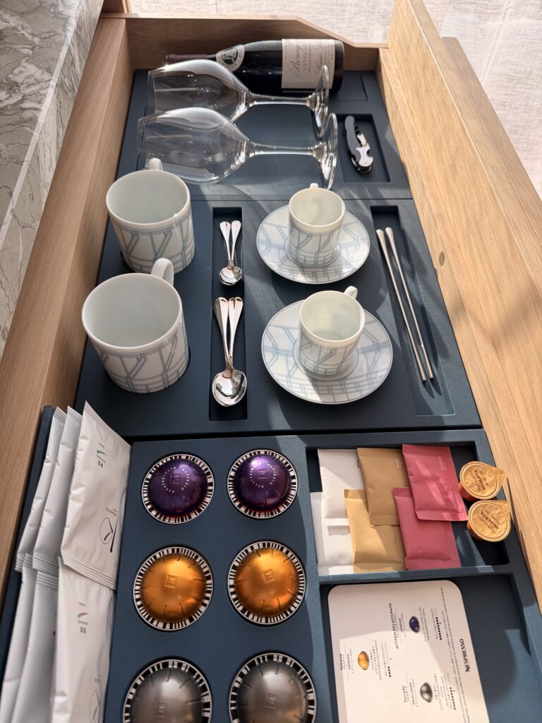 引き出しにはコーヒーカップやヴァーチュオのカプセル、紅茶や日本茶のティーバッグがありました。