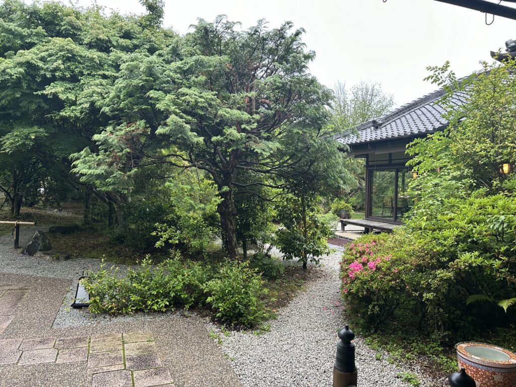 最後部屋に戻る途中の中庭を撮影させていただきました。右手が朝食会場の建物です。